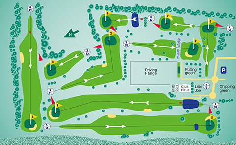 Driving Range mit 16 Abschlagplätzen (teilweise überdacht), Putting Green, Pitching Green und Übungsbunker